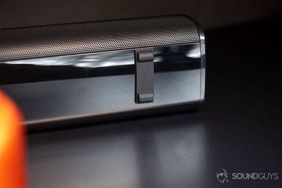 К счастью, Stage V2 не выглядит и не кажется таким дешевым, как есть. Если не считать немного толстого пластика вокруг задних портов, он красивый и гладкий, с глянцевой поверхностью сверху и прочной металлической решеткой спереди. Блестящий пластик, кажется, склонен притягивать пыль или, по крайней мере, делать его более заметным, но в остальном Creative преуспела в эстетике и качестве сборки. То, что звуковая панель немного сужается к задней части, является особым улучшением оригинальной Creative Stage.