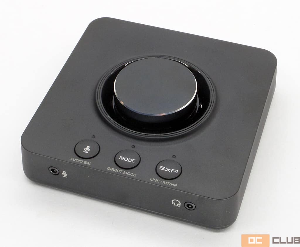 “Чёрный прямоугольник с крутилкой” – самое краткое описание внешнего вида Creative SoundBlaster X3. Дизайн строгий, минималистичный, без налета псевдо-геймерности и кричащих цветов. Размеры небольшие – 129 х 129 х 40 мм. В центре расположен довольно крупный регулятор громкости с тонкой блестящей вставкой.
