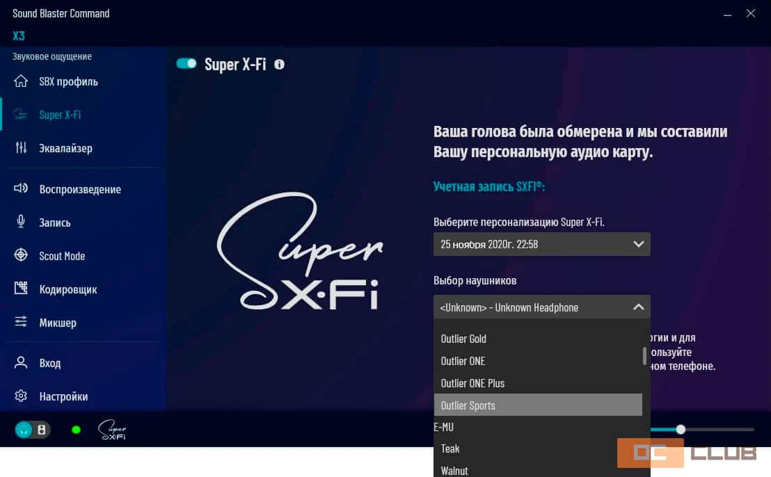 Первый подобный – Super X-Fi. Эта технология работает только с наушниками, и здесь всё не так просто. Нужно установить приложение на смартфон (а скачать его будет не так-то и легко), зарегистрироваться, и после согласно инструкциям произвести сканирование головы и геометрии уха. После входа в профиль уже в ПО Sound Blaster Command можно выбрать модель наушников, и скорее всего ваших там не будет. В таком случае можно выбрать универсальные настройки под наушники-вкладыши или полноразмерные, или любой на свой вкус. От профиля к профилю звук сильно разный, рекомендую попробовать различные.