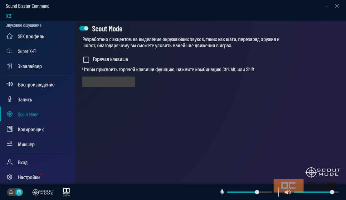 Вкладка Scout Mode понравится тем, кто играет в многопользовательские шутеры. Шаги противников становятся более различимы и легче понять, где топают. Действительно полезная рабочая штука. Можно назначить горячую клавишу для быстрой активации.