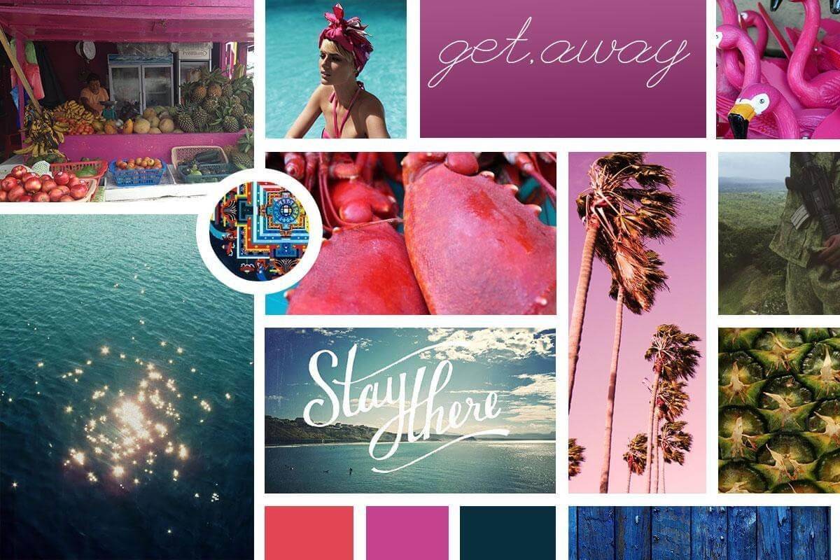 Это пример мудборда. Если понравится заказчику, значит, он получит дизайн в сине-розовых тонах, с рукописными шрифтами и летним настроением.