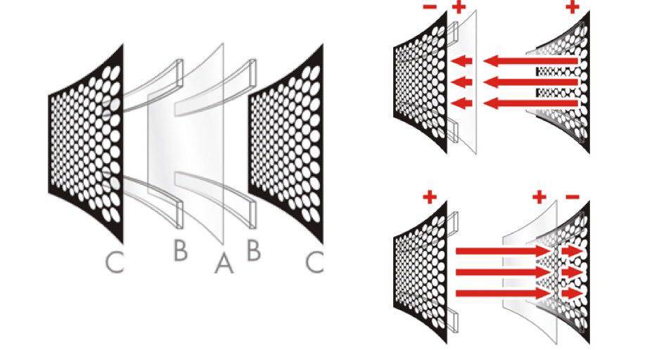 Слева: A — пленочная мембрана, B — изолирующие пластины-ограничители ClearSpar, C — статоры MicroPerf Справа: Работа электростатов. Мембрана всегда заряжена положительно. На статоры подается заряд, положительный притягивает к себе мембрану, а отрицательный — отталкивает.