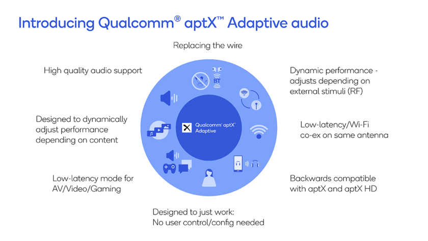AptX Adaptive – последний на данный момент кодек под «брендом» aptX. По заявлению Qualcomm этот кодек в будущем заменит aptX HВ и aptX LL. По качеству звука он стоит между aptX и aptX HD. А по времени задержки приближается в aptX LL. Не так давно объявленный aptX Voice – это вариант Adaptive под голосовую связь.