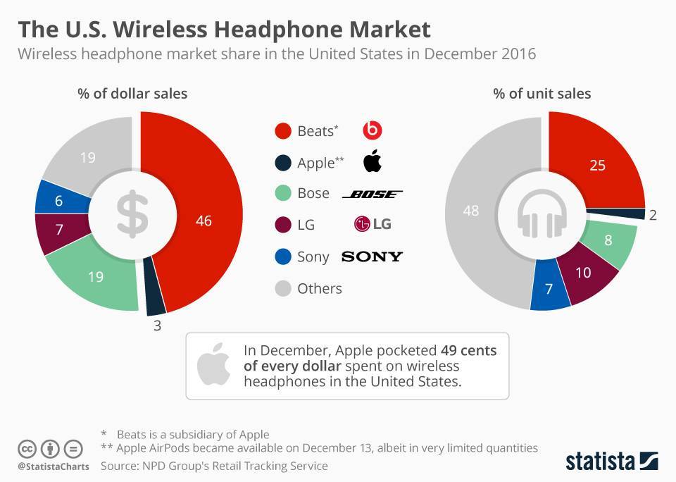 С начала 2017 года в США было продано более 900000 полностью беспроводных наушников, при этом, по данным NPD Group из этого числа на продажу AirPods пришлось около 85%. Apple продолжает доминировать в этом сегменте, не давая конкурентом занять значимое положение ввиду того, что не пускает их внутрь собственной экосистемы.