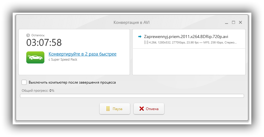 И всё бы ничего — все эти дополнительные фишки либо не нужны, либо лично мне не слишком мешают, — но есть вторая, куда более существенная проблема. Дико медленная скорость обработки видео файлов просто зашкаливает. Скорее всего программа конвертирует картинку даже в тех случаях, когда это делать не требуется. Отказаться от конвертации видео и преобразовать в другой формат только звук, по всей видимости, невозможно. По крайней мере, я не нашёл способа сделать это. Такой подход выливается в чрезвычайно медленную обработку. На каждый фильм в среднем будет уходить от одного до нескольких часов.