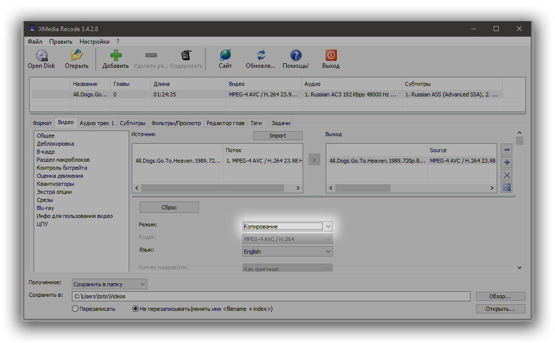 На вкладке Видео выбираем режим Копирование, чтобы видео дорожка у нас сохранилась в первоначальном виде: