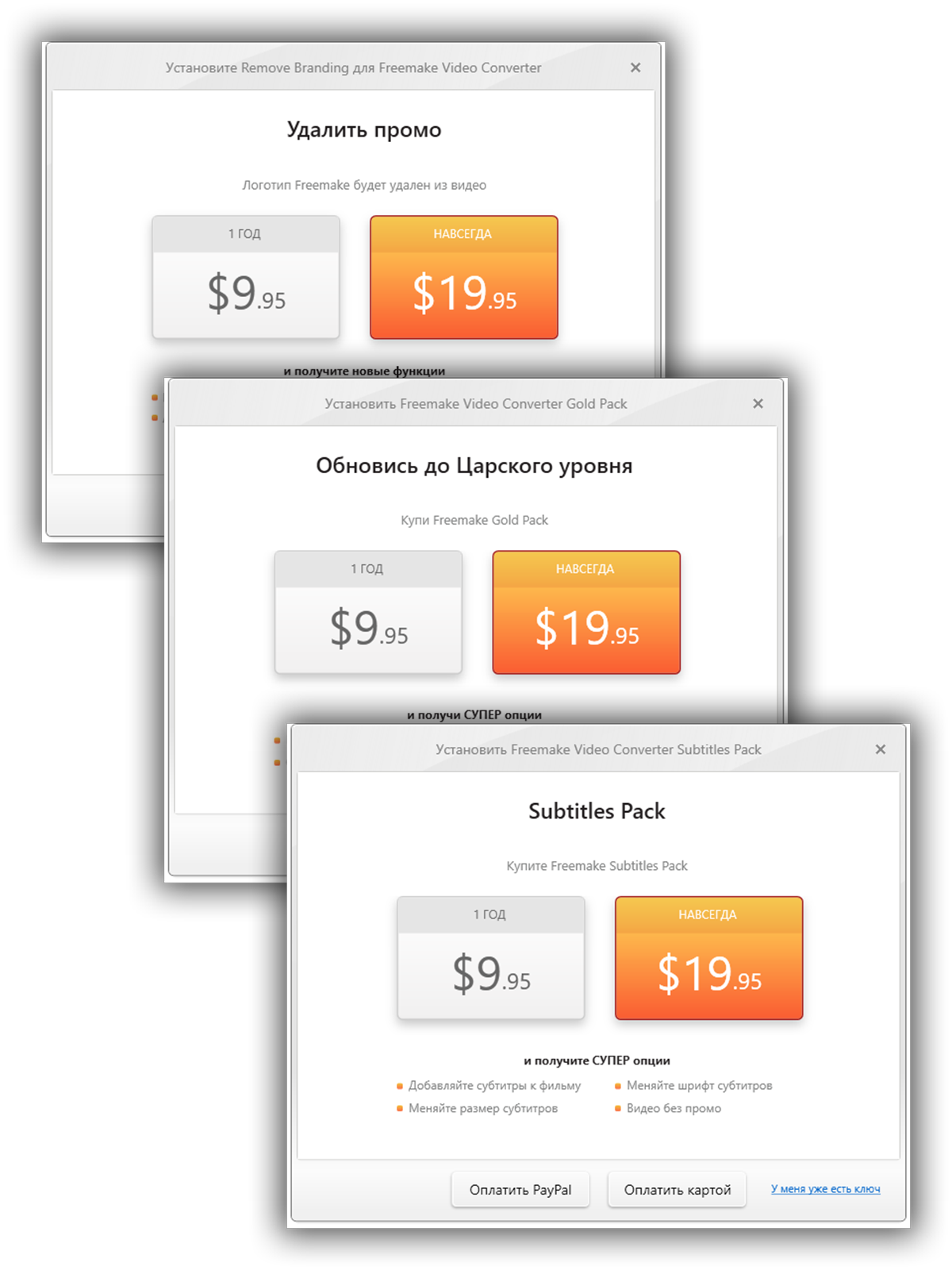 И всё было бы прекрасно, если бы не два существенных недостатка такого решения. Во-первых, “чихать” программа позволяет только за деньги. То есть, если возникнет необходимость вставить субтитры, добавить свой логотип или добавить скорости процессу конвертации файлов, то за это удовольствие придётся платить. К тому же каждое сконвертированное видео обрастает логотипом Freemake, убрать который тоже можно только за деньги.