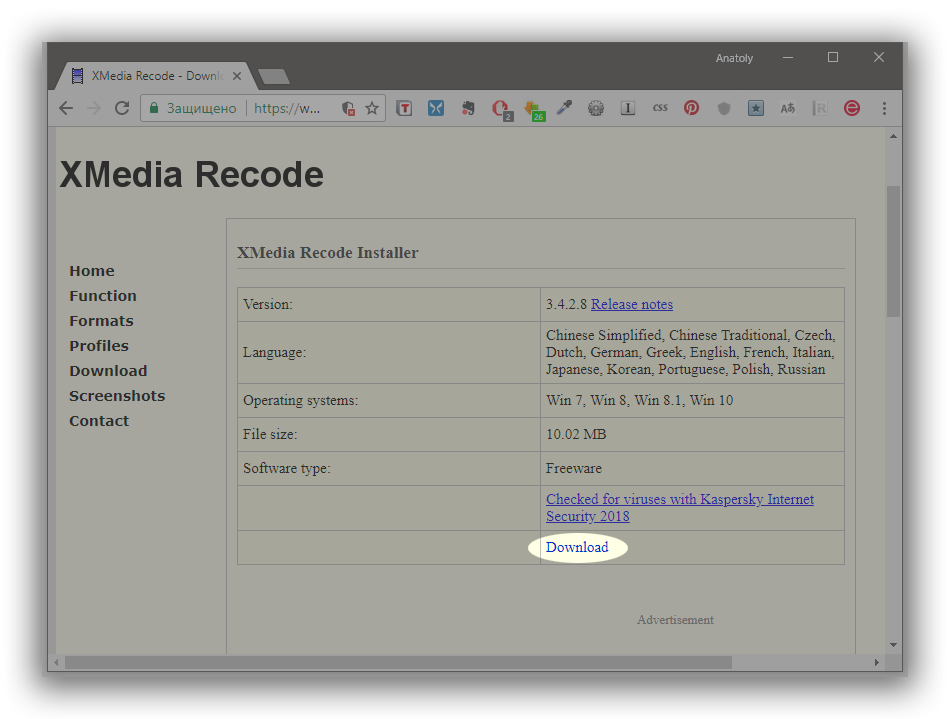 Теперь о приятном. Второй из способов конвертации звуковой дорожки в видео файле выглядит лишь чуток сложнее, но зато скорость обработки файлов в этом случае возрастает раз в 30(!), если не больше. Мы опять же будем использовать стороннюю программу. Теперь она будет называться XMedia Recode. На сайте программы нет русского языка, так что вот вам сразу ссылка на страничку для скачивания. На скриншоте видно, куда надо щёлкнуть, чтобы скачать последнюю версию программы.