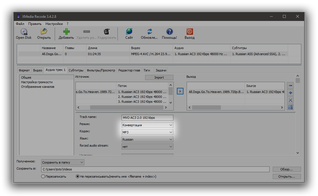 Когда звуковая дорожка выбрана, устанавливаем её параметры в выходном файле. В нашем случае выбираем режим Конвертация и кодек MP3.
