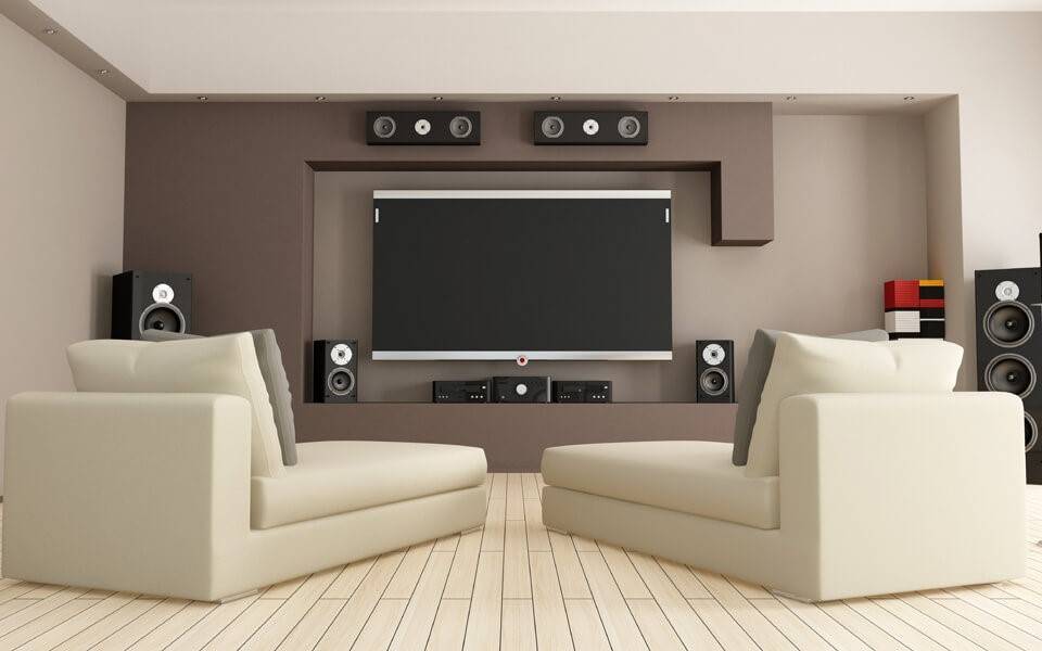 Для менее глобальных внедрений можно приобрести домашний кинотеатр с хорошим сабвуфером и колонками и подключить к стационарному экрану телевизора или монитора компьютера. Акустика может иметь разную конфигурацию. Для помещения до 30кв.м. объемный звук обеспечит акустика 5.1. Это аудиосистема, установленная с сабвуфером непосредственно рядом с экраном и расставленные по сторонам четыре колонки.