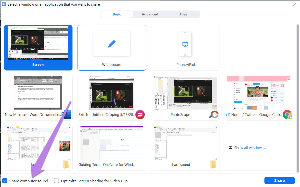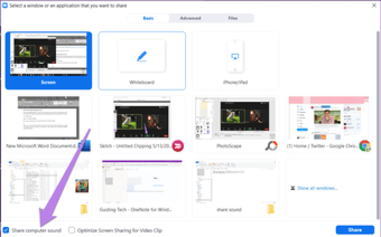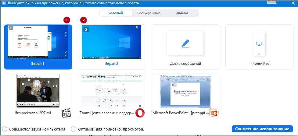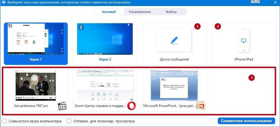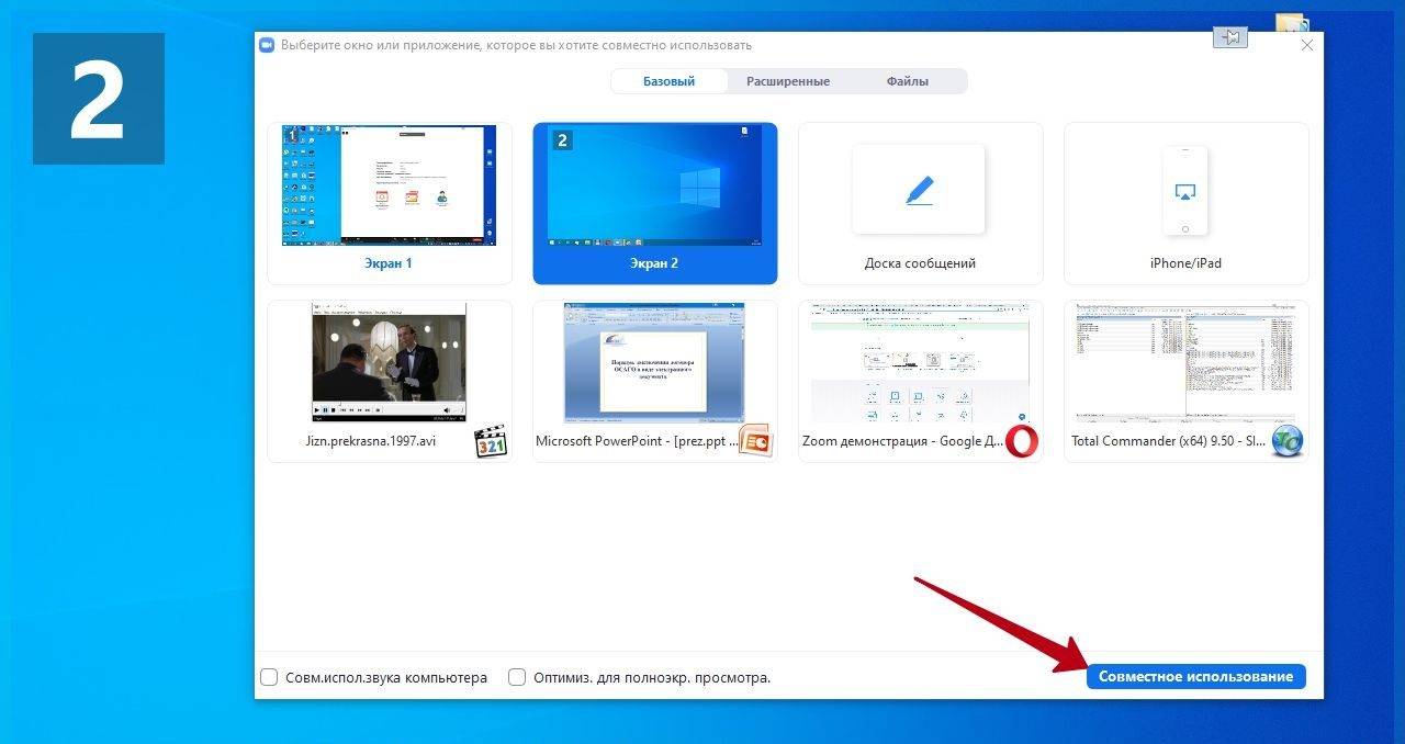 Во втором ряду располагаются окна открытых программ. Например – браузер, видеоплеер, презентация (3). Выберите окно программы, чтобы показать в зум только его, и не показывать весь рабочий стол.