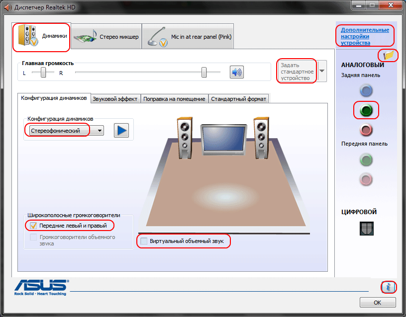 Здесь сразу задаем конфигурацию динамиков (стерео), задаем наше аналоговое устройство устройством по умолчанию (после чего соответствующая кнопка потухнет), отключаем, если, не дай Бог, включено, объёмное звучание.