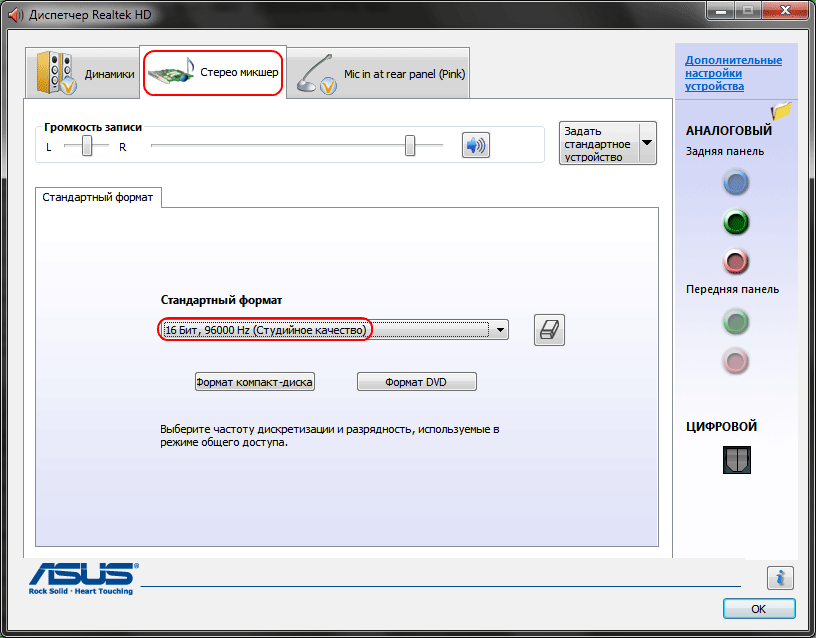 Здесь всё элементарно. Данное устройство записывает всё, что вы слышите через динамики, т. е., тот готовый звуковой поток, который Windows передает на звуковую карту. Приводится он к указанному виду (раз микшер работает с частотой дискретизации 96 кГц, то и тут поставим столько же).