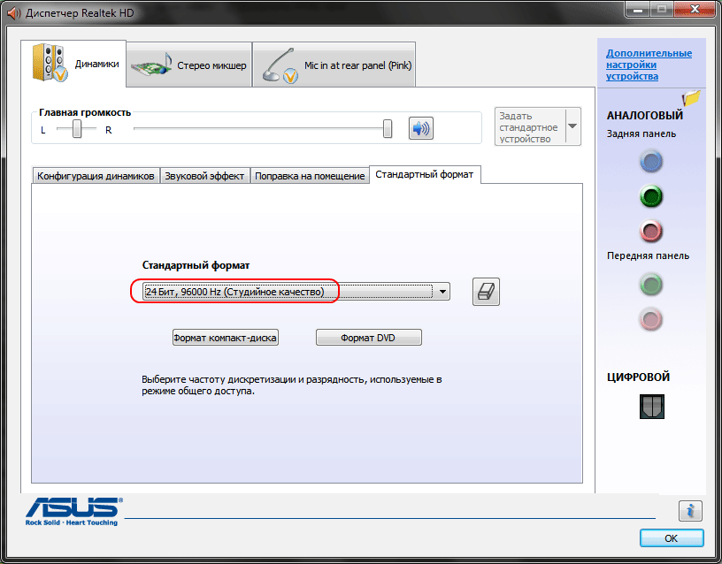 Здесь можно задать параметры системного микшера — с какой частотой дискретизации и глубиной бит Windows будет микшировать все воспроизводимые звуки. Установим 24 бит, 96 кГц. Почему — расскажу далее.