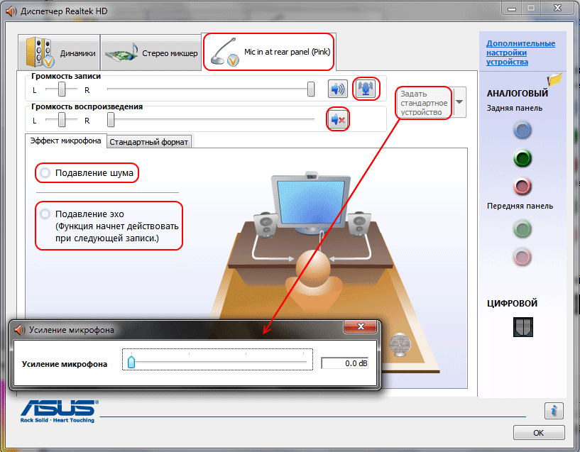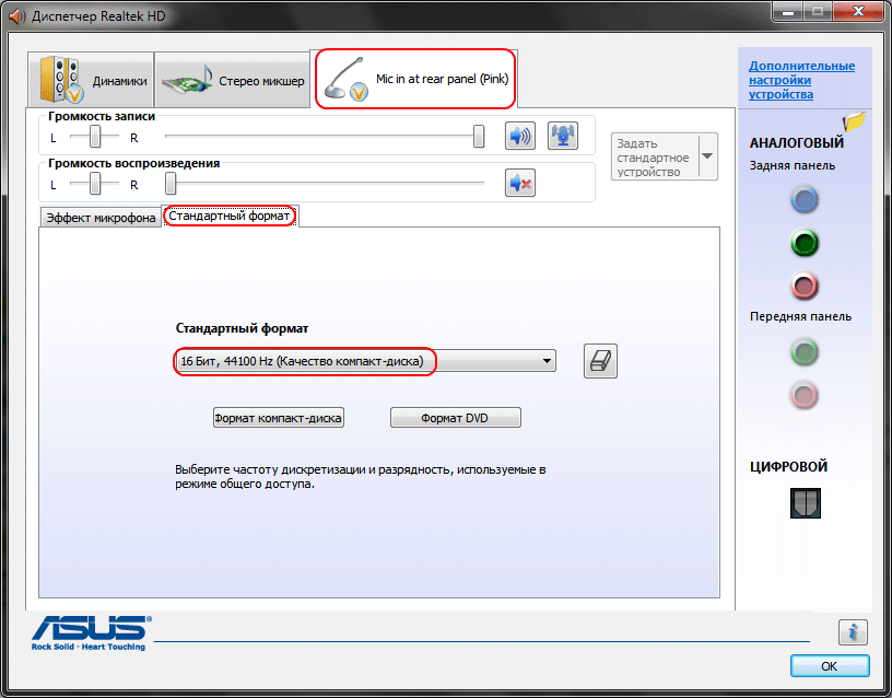 Также обратите внимание, что подключённые разъемы отображаются ярким цветом — в нашем случае к зелёному выходу подключены динамики, к розовому входу — микрофон. Здесь — одна весьма важная деталь: дважды нажав по значку разъема, вы увидите окно с выбором типа подключенного устройства