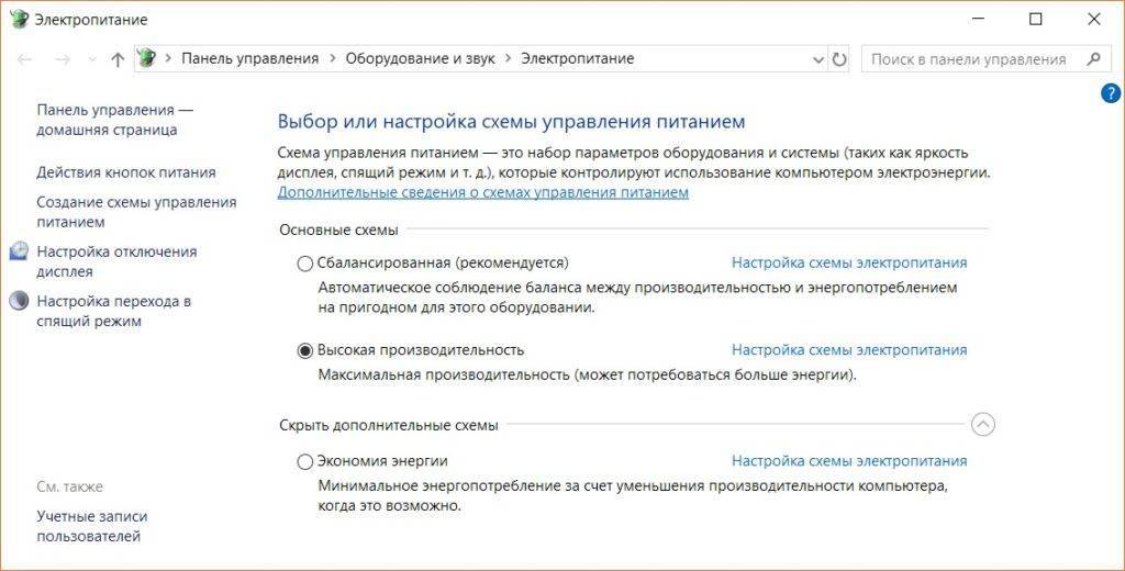 Зайдите в панель управления Windows, затем выберете пункт «Оборудование и звук», внутри него найдете пункт «Электропитание». Войдите в пункт «Электропитание» и выберите режим «Высокая производительность».