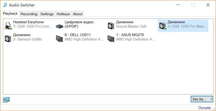 - Можно переключать устройства прямо в трее одним кликом мыши.