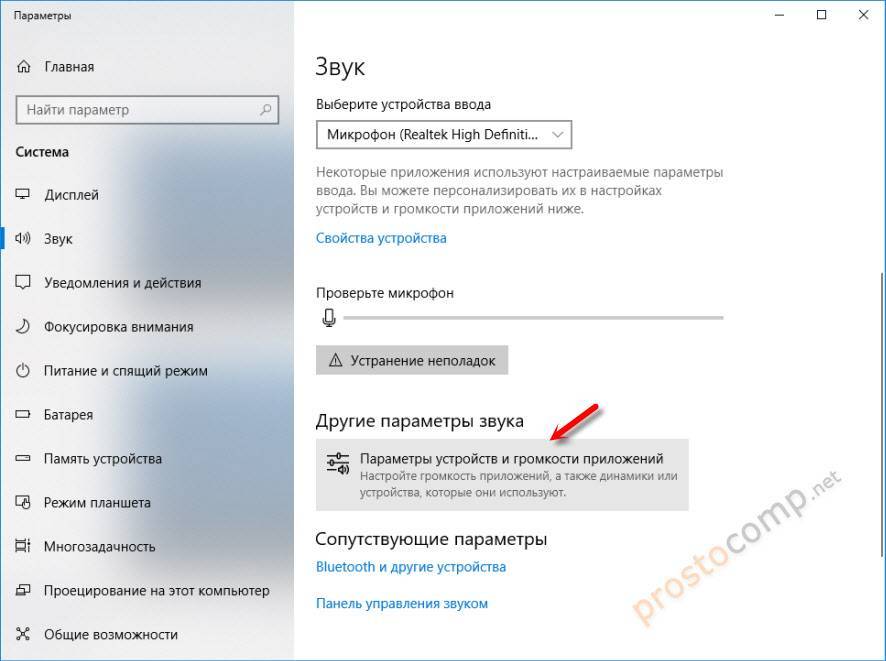Откроется окно с основными настройками звука в Windows 10. Там можно изменить устройства ввода и вывода, отрегулировать громкость, проверить микрофон и открыть «Другие параметры звука».