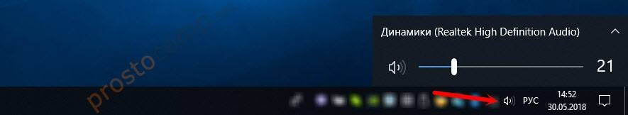 - Жмём на динамик, который отвечает за громкость в панели задач левой кнопкой мыши.