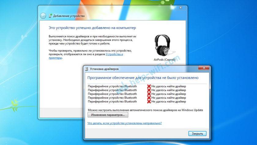 Дальше я просто удалил AirPods из списка уже подключенных устройств (так как я уже пробовал их подключить) и установил соединение заново. И уже в этот раз Windows 7 установила практически все драйвера. Кроме “Периферийное устройство Bluetooth”. Но наушники без проблем начали работать, несмотря на то, что возле них остался желтый восклицательный знак.