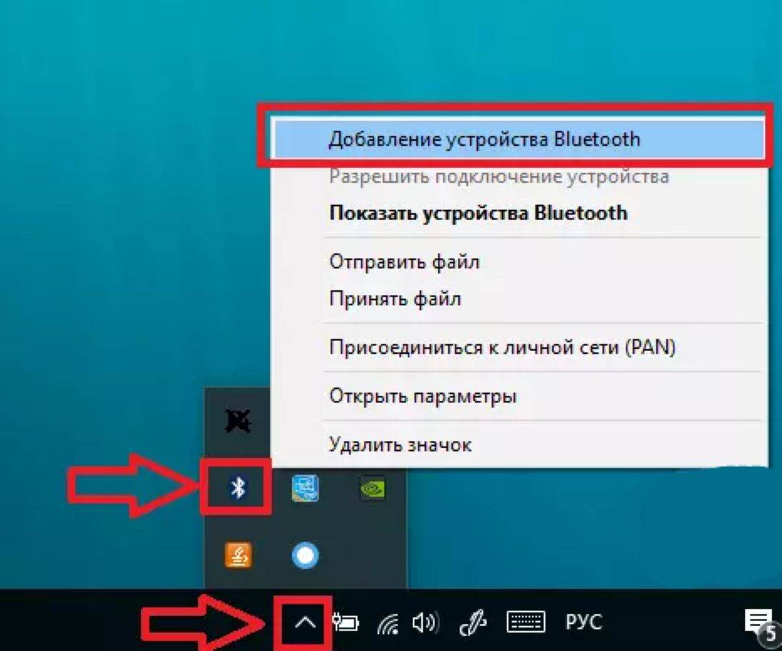 - В правом углу панели задач (системный лоток) нажмите на значок Bluetooth (он может быть спрятан под стрелочкой) → нажмите «Добавление устройств Bluetooth». Убедитесь, что устройство включено.