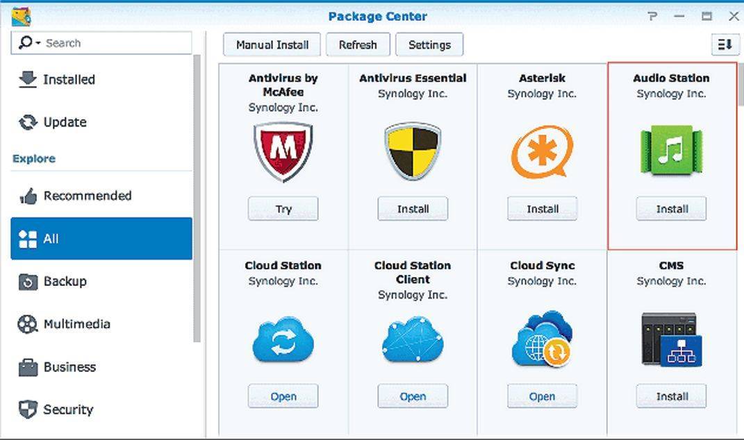 Чтобы получить доступ к трекам через NAS-устройство Synology в домашней сети, сначала потребуется установка соответствующего приложения. Откройте «Программный центр», выберите «Рекомендации», а затем под баннером «Audio Station» нажмите кнопку «Установить». Во время установки приложение Audio Station автоматически создает общую папку «music».