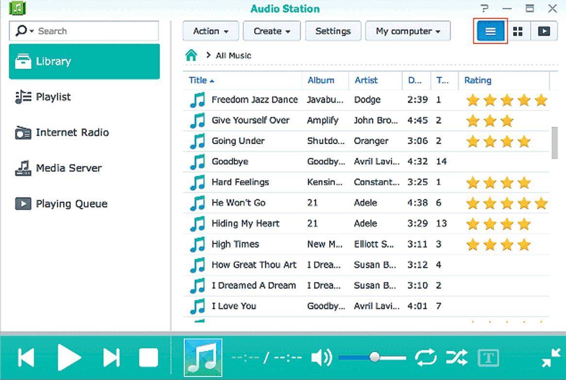 Перейдите в главное меню через соответствующий ярлык и выберите «Audio Station». Для просмотра музыкальной коллекции в левой колонке в разделе «Моя музыка» выберите «Вся музыка». Можно сортировать список по конкретным критериям. С помощью кнопок в правом верхнем углу можно переключаться между списком и предварительным просмотром.