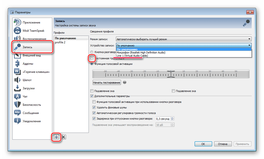 В разделе «Запись» также добавляете новый профиль, в пункте «Устройство записи» выбираете «line 1 (Virtual Audio Cable)» и ставите точку возле пункта «Постоянная трансляция».