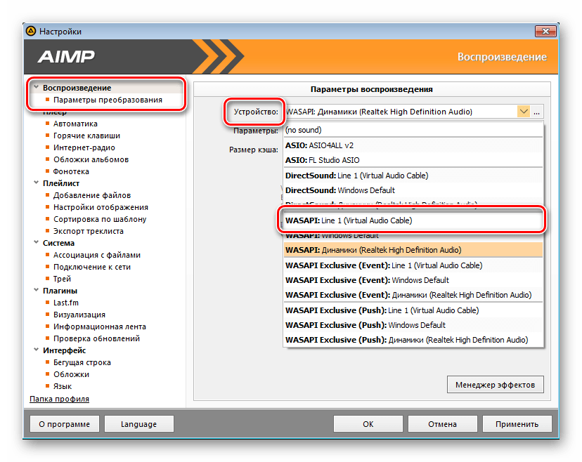 В разделе «Воспроизведение» в пункте «Устройство» вам необходимо выбрать «WASAPI: Line 1 (Virtual Audio Cable) ». После чего нажмите «Применить», а затем выйдите из настроек.