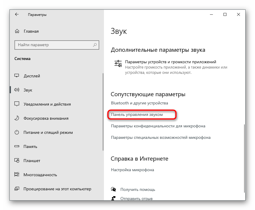 В блоке «Сопутствующие параметры» найдите строку «Панель управления звуком» и кликните по ней.