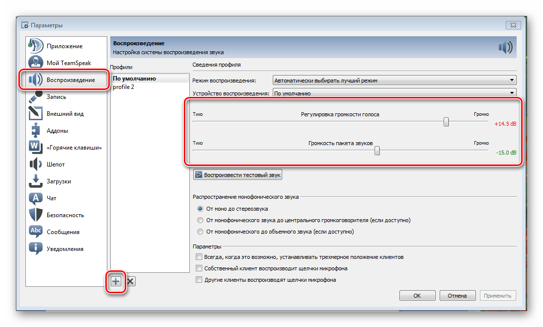 В разделе «Воспроизведение» добавьте новый профиль, нажав на плюсик. После чего уменьшите громкости на минимум.