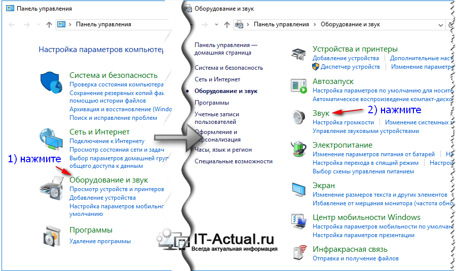 В открывшемся системном окне Панель управления проследуйте по пути и откройте конечный пункт Оборудование и звук -> Звук.