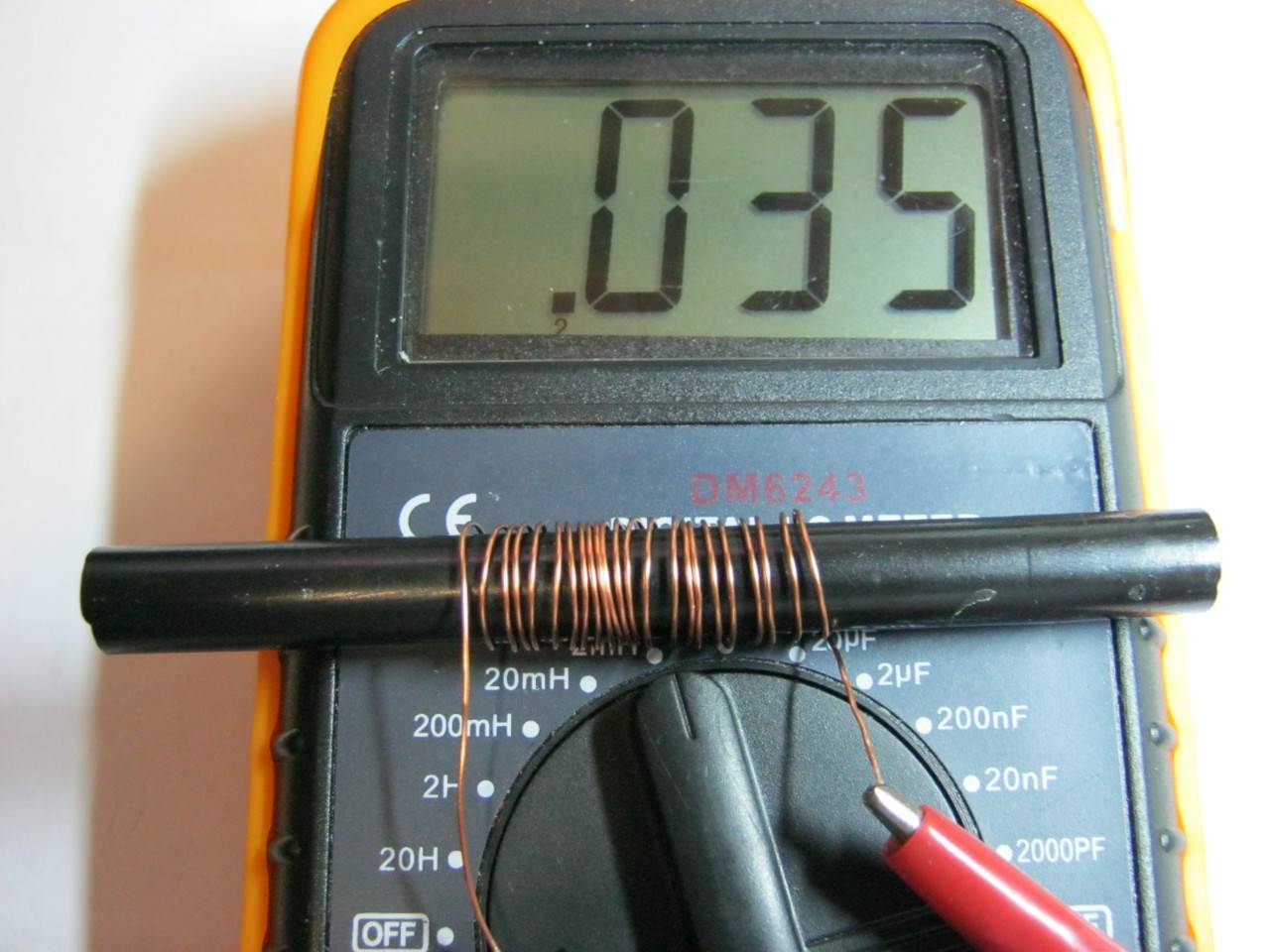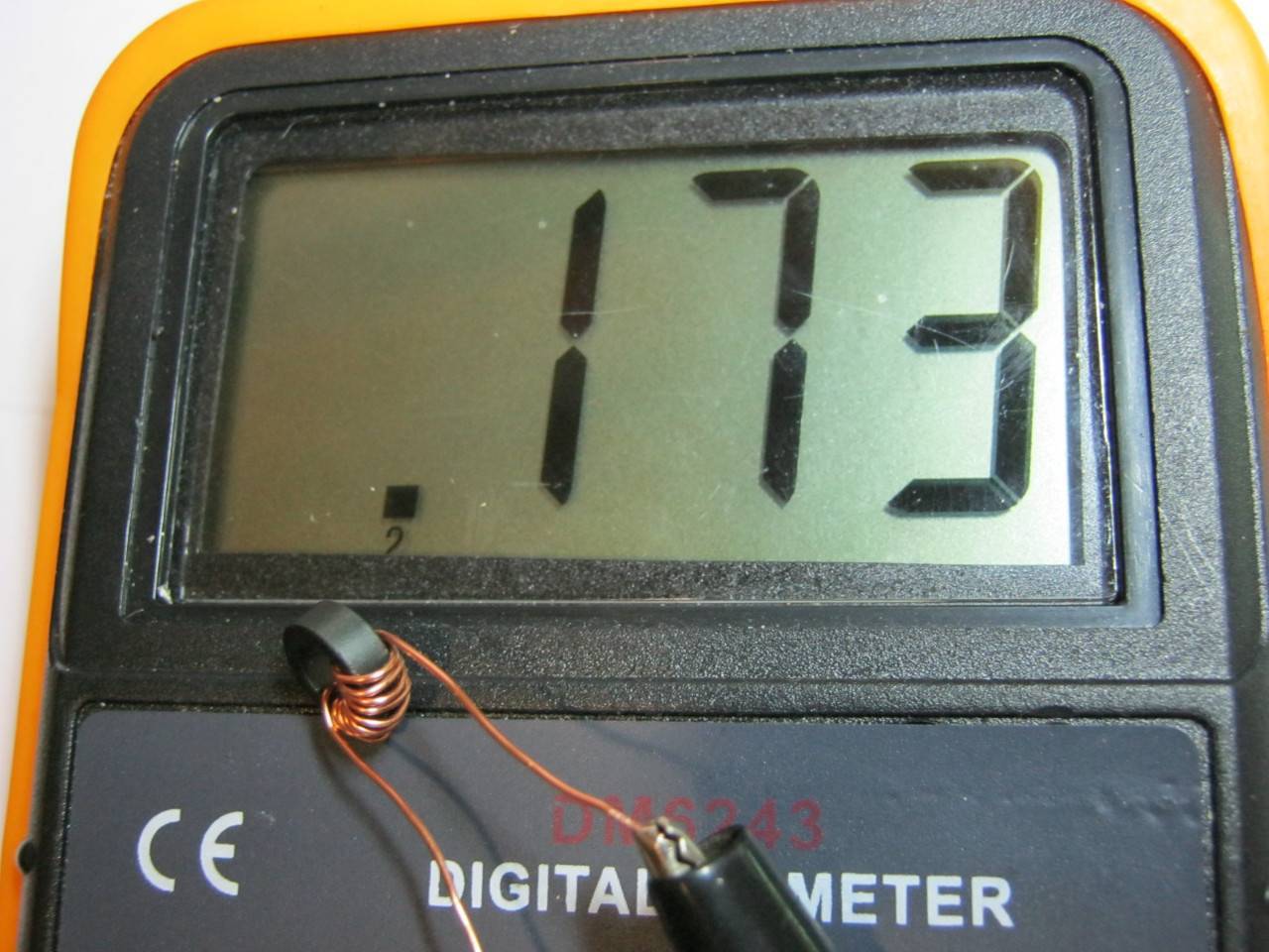 Совсем маленькая индуктивность. Убавил количество витков в 2 раза, индуктивность уменьшилась в 10 раз. Вывод: чем меньше количество витков — тем меньше индуктивность и наоборот. Индуктивность меняется не прямолинейно виткам.