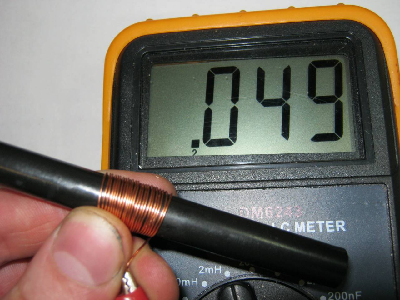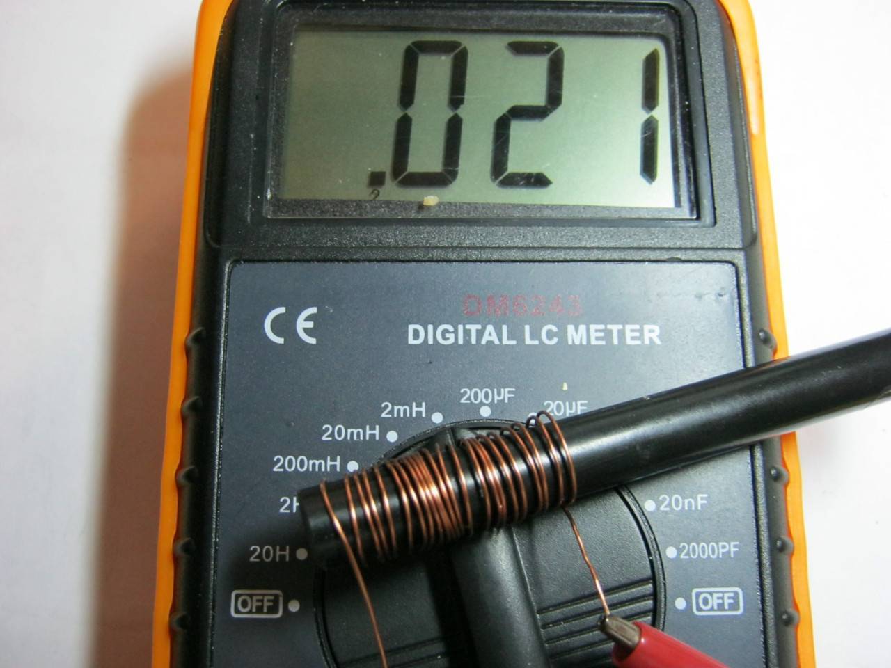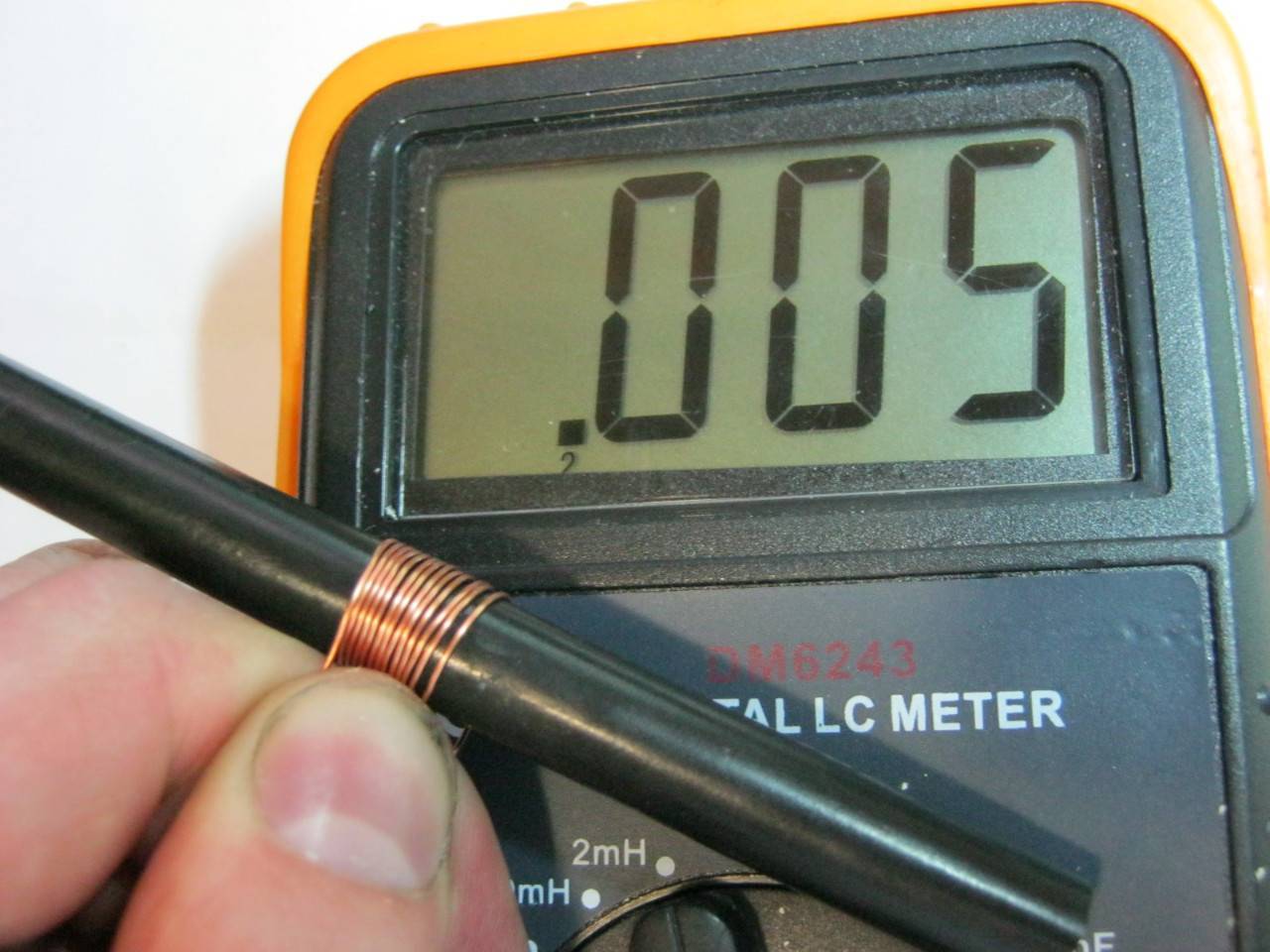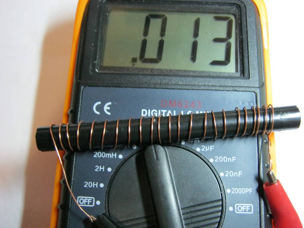 13 микрогенри. Делаем вывод: для максимальной индуктивности мотать катушку надо «виток к витку».