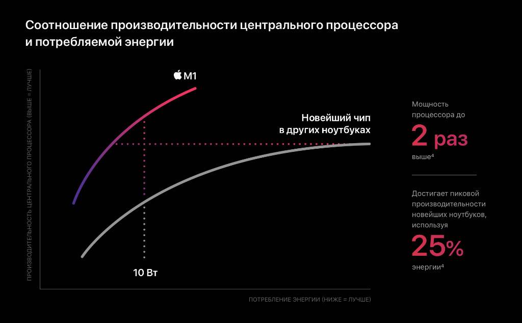 Таким образом, M1 обеспечивает лучшую в отрасли производительность на ватт. Вот почему первые модели Apple Silicon MacBook Air и MacBook Pro могут предложить такие заметные улучшения в времени автономной работы по сравнению с их предшественниками Intel.
