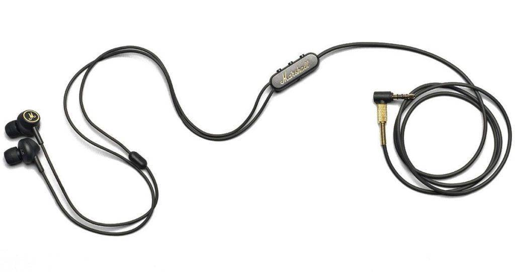 Кабель устройства симметричный, круглый. На нём расположен пульт управления, украшенный блестящей курсивной надписью Marshall. Наушники выпускаются только в чёрном цвете.