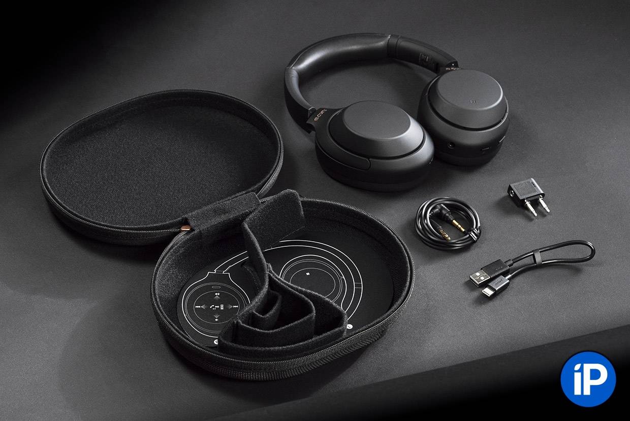 В коробках с наушниками можно найти практически одинаковый набор аксессуаров. И у Bowers & Wilkins PX7, и у Sony WH-1000XM4 есть жёсткий кейс для хранения и переноски, внутри которого есть кармашек для комплектных проводов. У Sony есть еще самолётный адаптер для подключения наушников к аудиосистеме во время полётов.