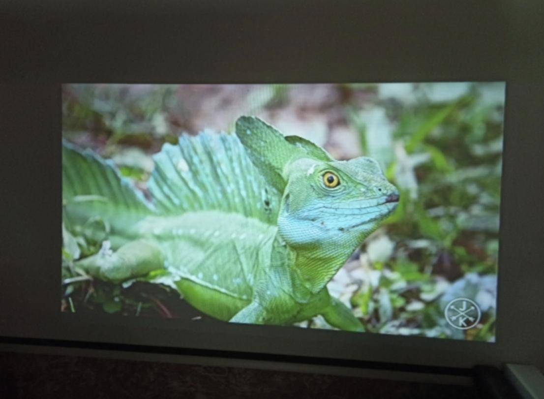 Внутри встроена технология диффузного отражения (меньше устают глаза), есть разрешение FHD. Девайс с легкостью проецирует на стене картинку с диагональю от 40 до 120″ на расстоянии от 1 до 3-х метров. В зависимости от размера экрана становятся более отчетливо видны пиксели, как в меню, так и при выборе сериалов.