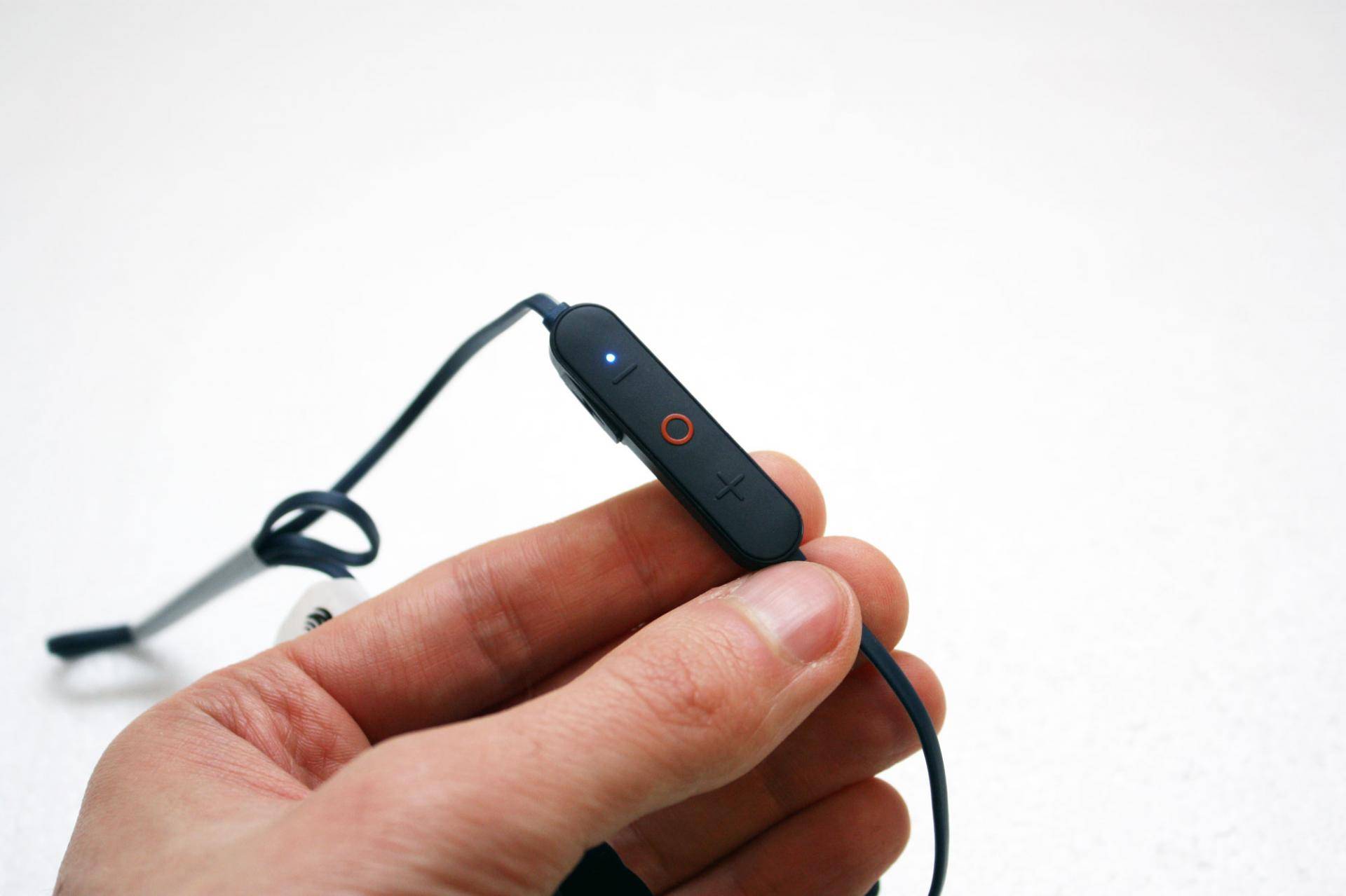 Подключение к смартфону происходит привычным способом. Зажимаем среднюю кнопку «О» на пульте наушников до мигания индикатора синим цветом. После этого смартфоном можно найти гарнитуру по Bluetooth и подключиться к ней.