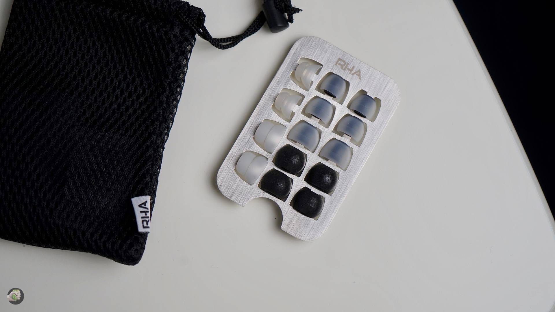 В первом отделении лежит комплект из дополнительных насадок разного типа и размеров на металлической пластине с лого RHA. Всего есть 4 пары силиконовых амбушюр стандартной формы: две пары маленьких, одна — средних и ещё одна — больших. При этом одна пара насадок среднего размера уже находится на самих наушниках. Есть две пары насадок типа «ёлочка» — маленькие и большие (или средние). И также есть одна пара пенных амбушюр.