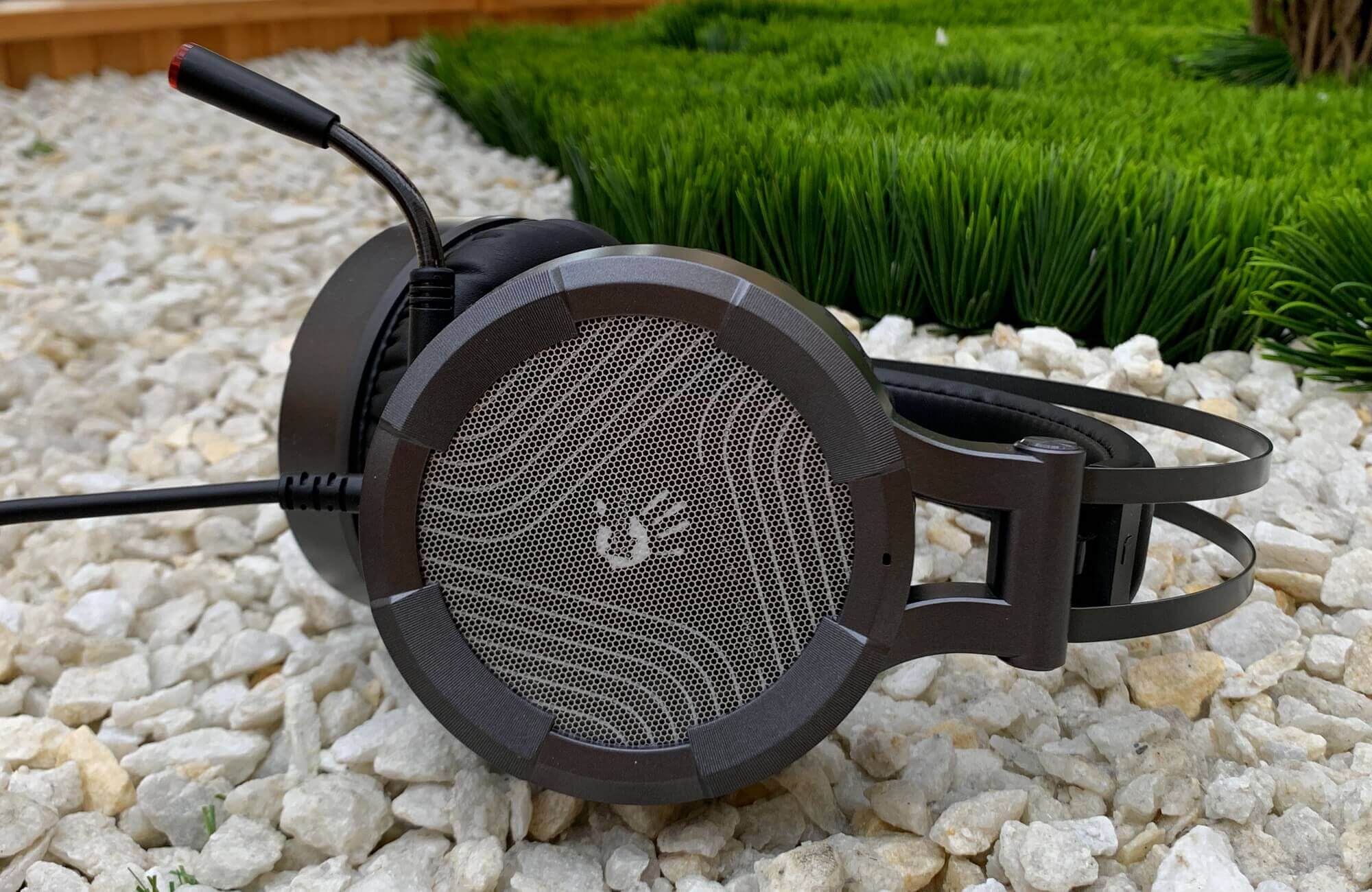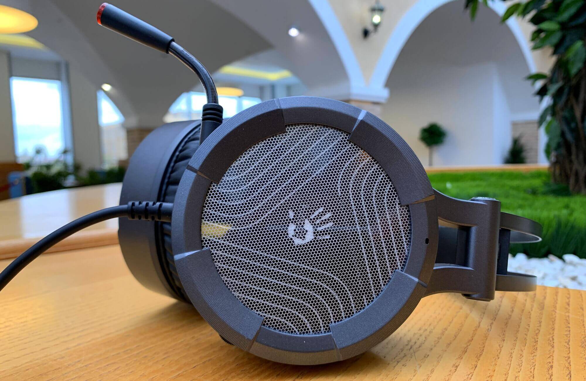 Пластиковые чашки для амбушюр наушников по бокам имеют прозрачный мелко-дырчатый дизайн, под которым укрывается логотип и подсветка при подключении аксессуара к компьютеру. Сама амбушюра состоит из простой и недорогой прорезиненной ткани.