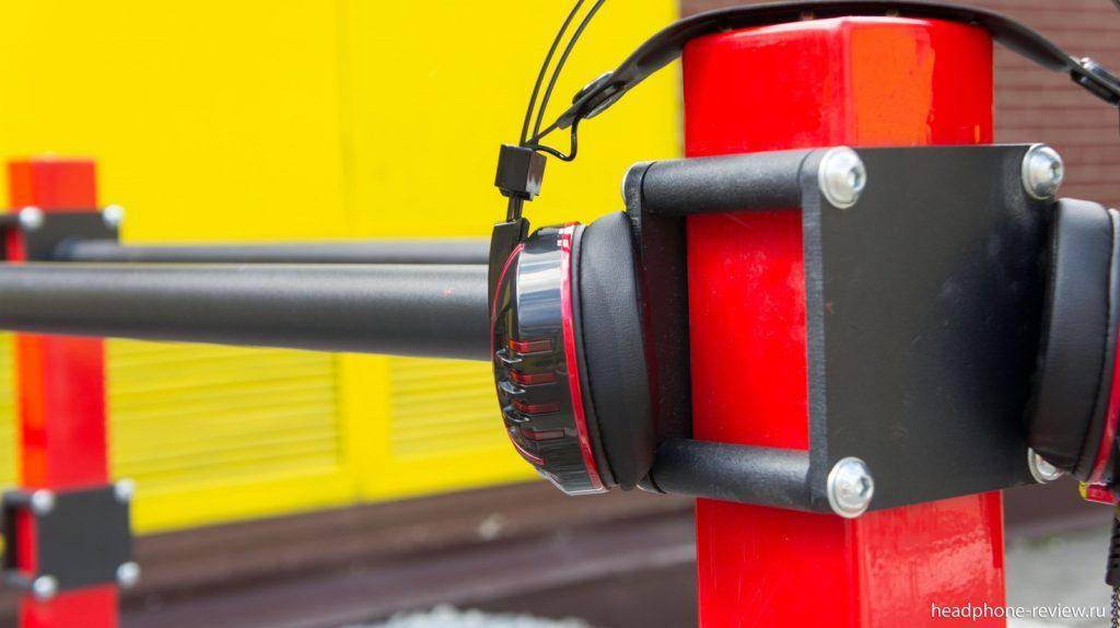 На левом «ухе» расположено колёсико регулировки громкости. Оно выкручивает звук на максимальную амплитуду до такого уровня, что звук можно слушать и вовсе не одевая аксессуар.