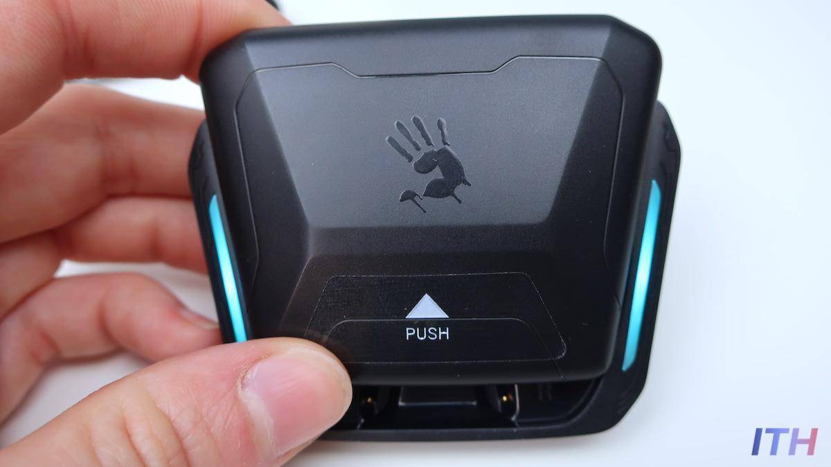 Кейс. В отличие от большинства беспроводных наушников с овальными кейсами в стиле AirPods или AirPods футляр Bloody M70 имеет трапецивидную форму с выдвижной магнитной крышкой. На крышке размещен логотип Bloody — та самая кровавая ладошка.