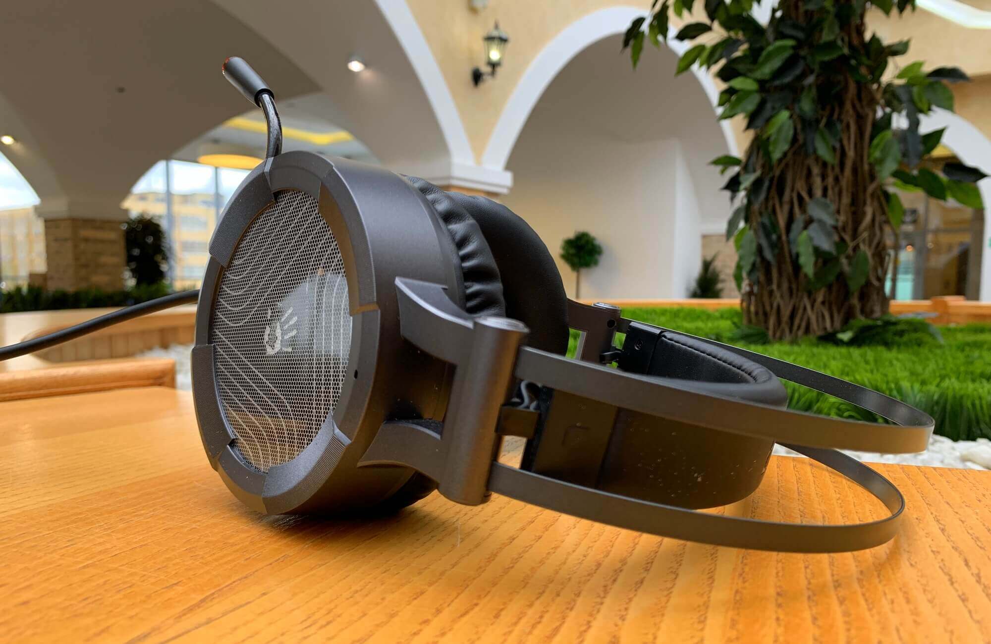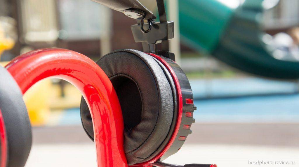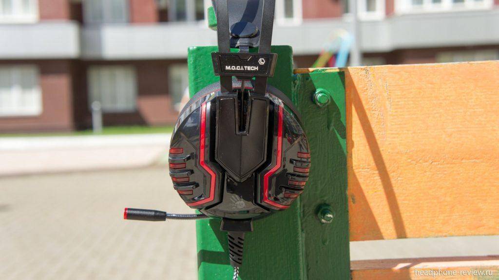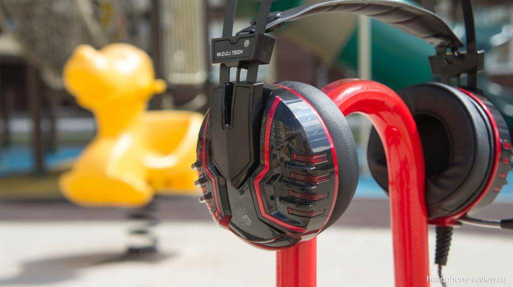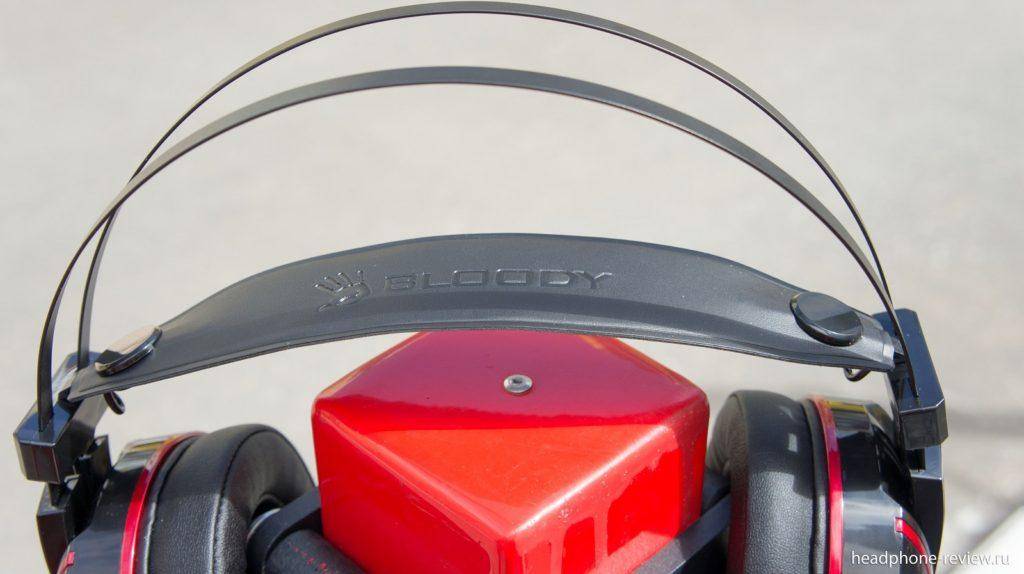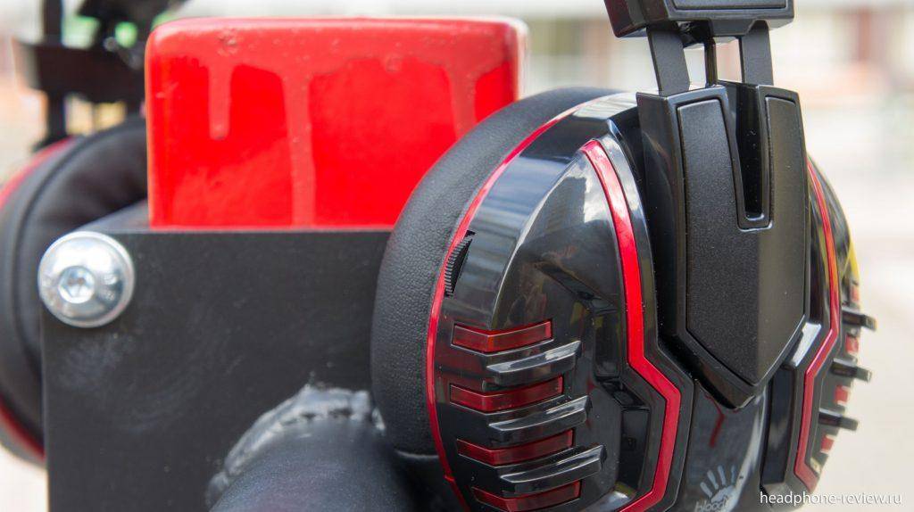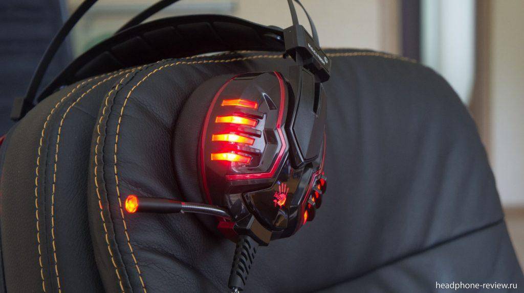 Мягкое оголовье подкрепляется общей металлической опорой, состоящей из двух параллельных секций. Сама подсветка имеет красный оттенок и работает на постоянной основе, когда наушники подключены к компьютеру. A4 Bloody хорошо и плотно садятся на голову, не вызывая неудобства.