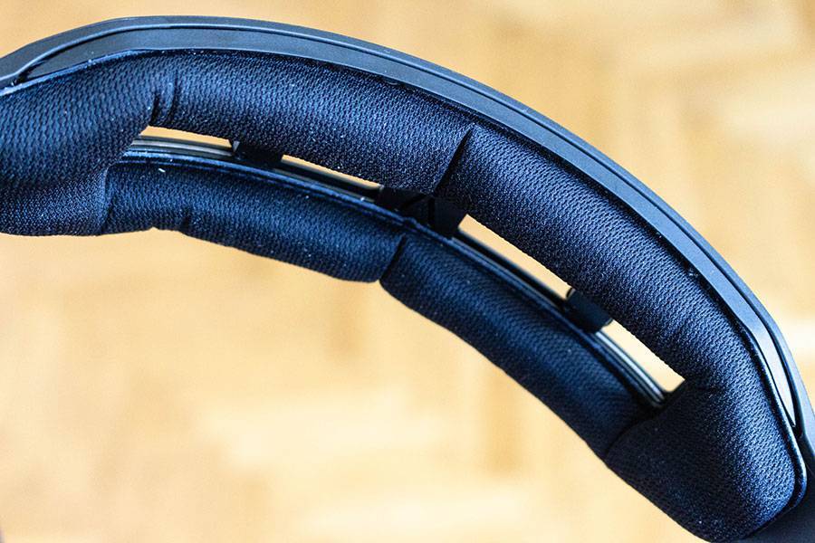 Внутренняя отделка оголовья из патентованной ткани отлично вентилируется, не позволяя голове потеть. С амбушюрами поступили интереснее: контактная часть из искусственной замши, боковая часть — из кожзама.