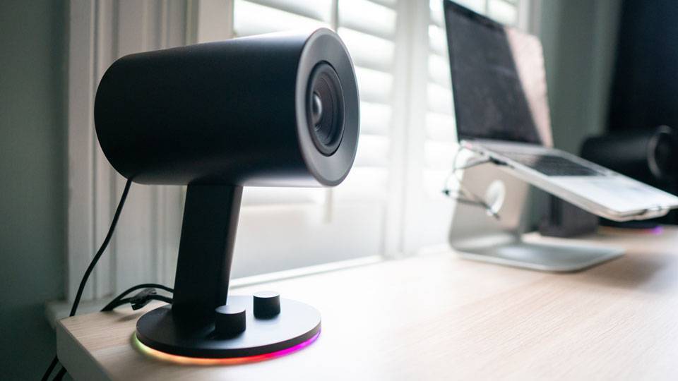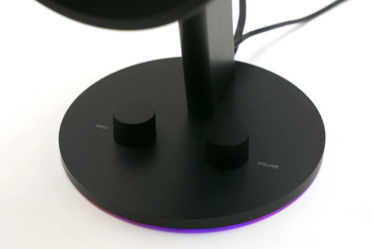 Простое низкопрофильное основание обеспечивает надежную опору, а на правом динамике расположены регуляторы низких частот и громкости. Из тонкого зазора под основанием исходит кольцо RGB-освещения, которое отлично выделяет чистый черный цвет остальных динамиков.