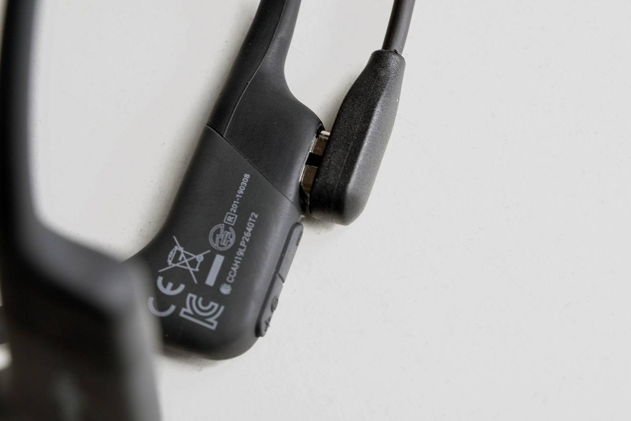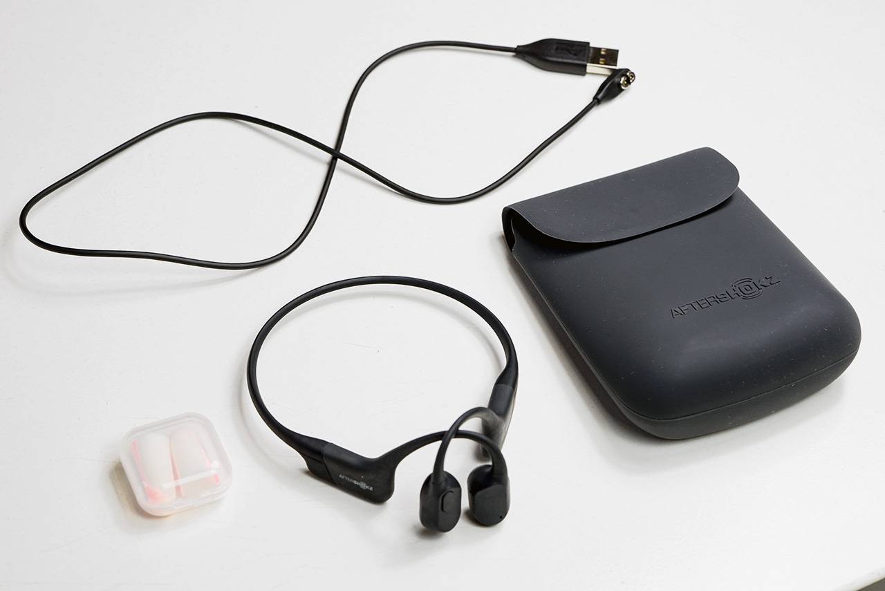 В комплекте с Aftershokz Aeropex, кроме самих наушников и двух кабелей зарядки (производитель о нас заботится), есть удобный силиконовый чехол с магнитной застёжкой и пара беруш.