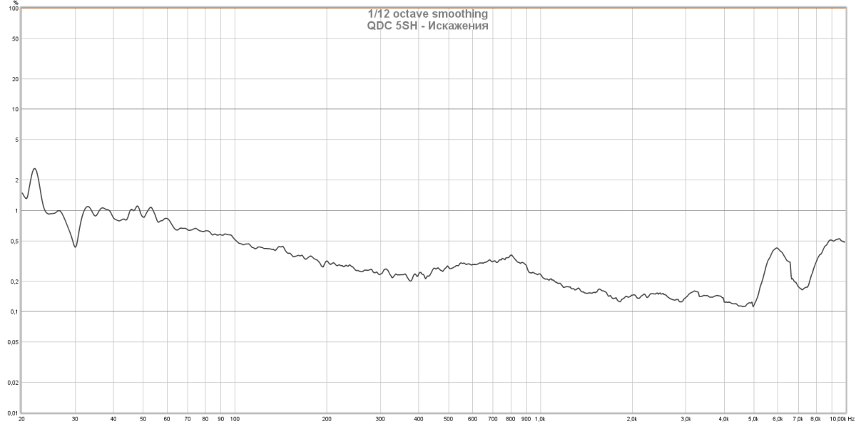 Искажения поднимаются выше отметки 0,5% лишь в зоне ниже 100 Гц. Если же сравнивать результаты с измеренными ранее многодрайверными арматурными наушниками, QDC 5SH демонстрируют буквально рекордно низкие показатели, что свидетельствует о высоком классе используемых излучателей.