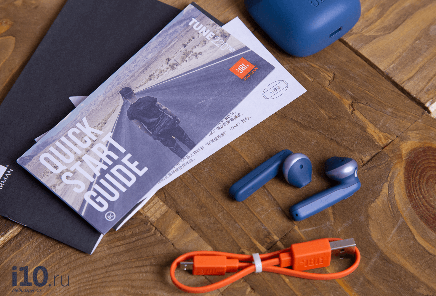 JBL Live 300TWS попадают к покупателю в небольшой коробке, в которой очень компактно расположились: сами наушники, зарядный кейс, 3 пары амбушюр (1 пара уже надета), 4 пары дополнительных креплений (одна тоже надета), зарядный кабель USB Type-C и документация.