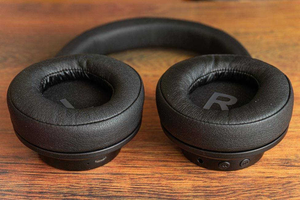 Все остальные функциональные элементы расположились на правой. Спереди: кнопка активации шумоподавления (ANC) с отдельным светодиодом и отверстие микрофона. Внизу — 3,5-мм разъем, кнопки управления воспроизведением. Ну и сзади — кнопка включения и ещё один светодиод, отображающий состояние наушников.